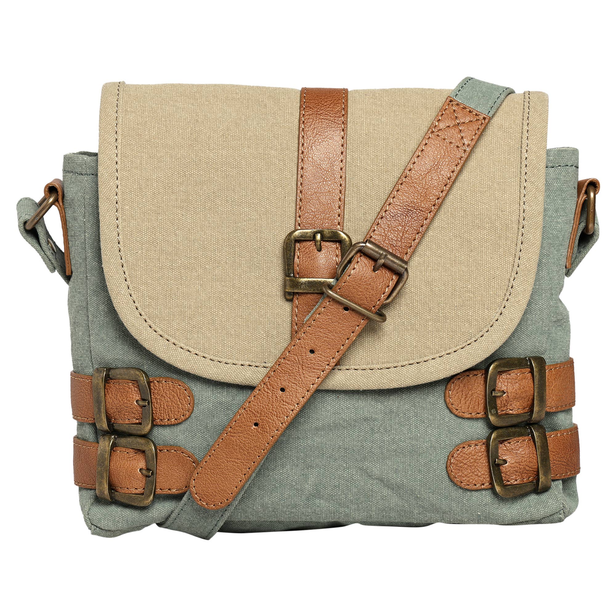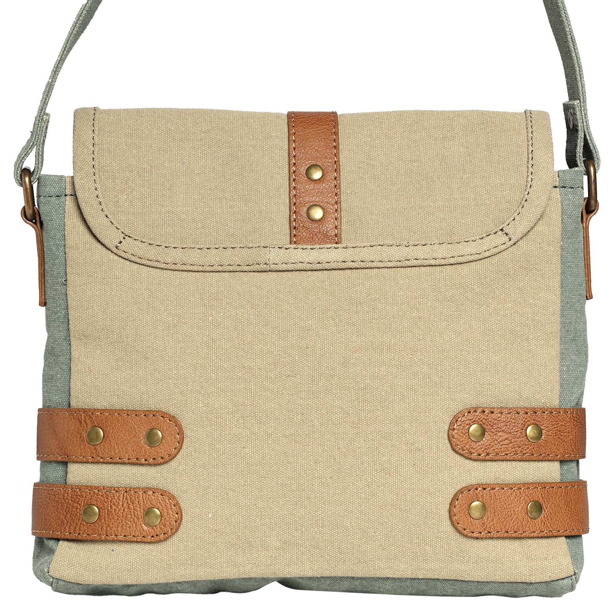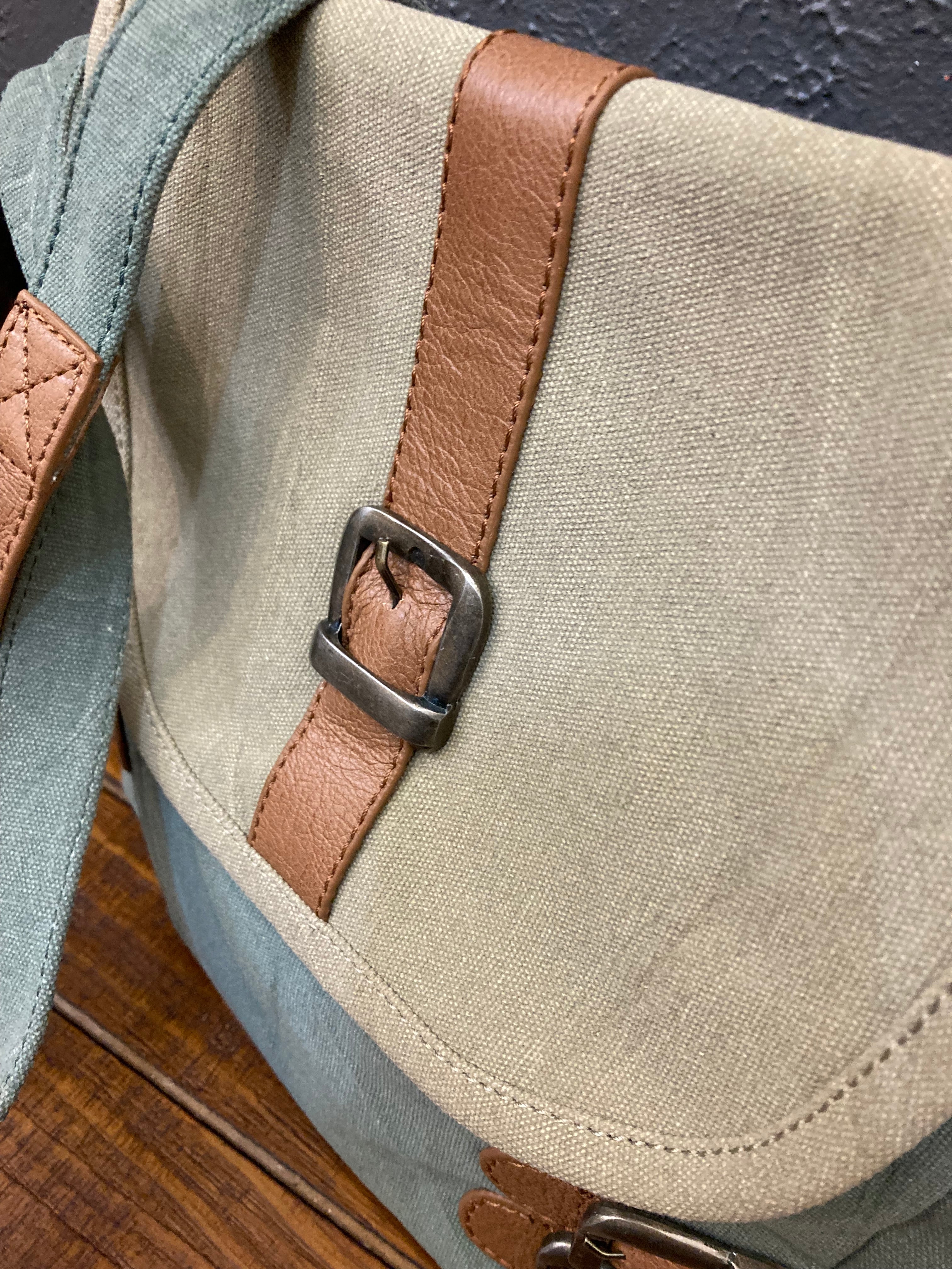 Closure: Magnetic Snap Closure Material: Up-Cycled Canvas with leather caramel.