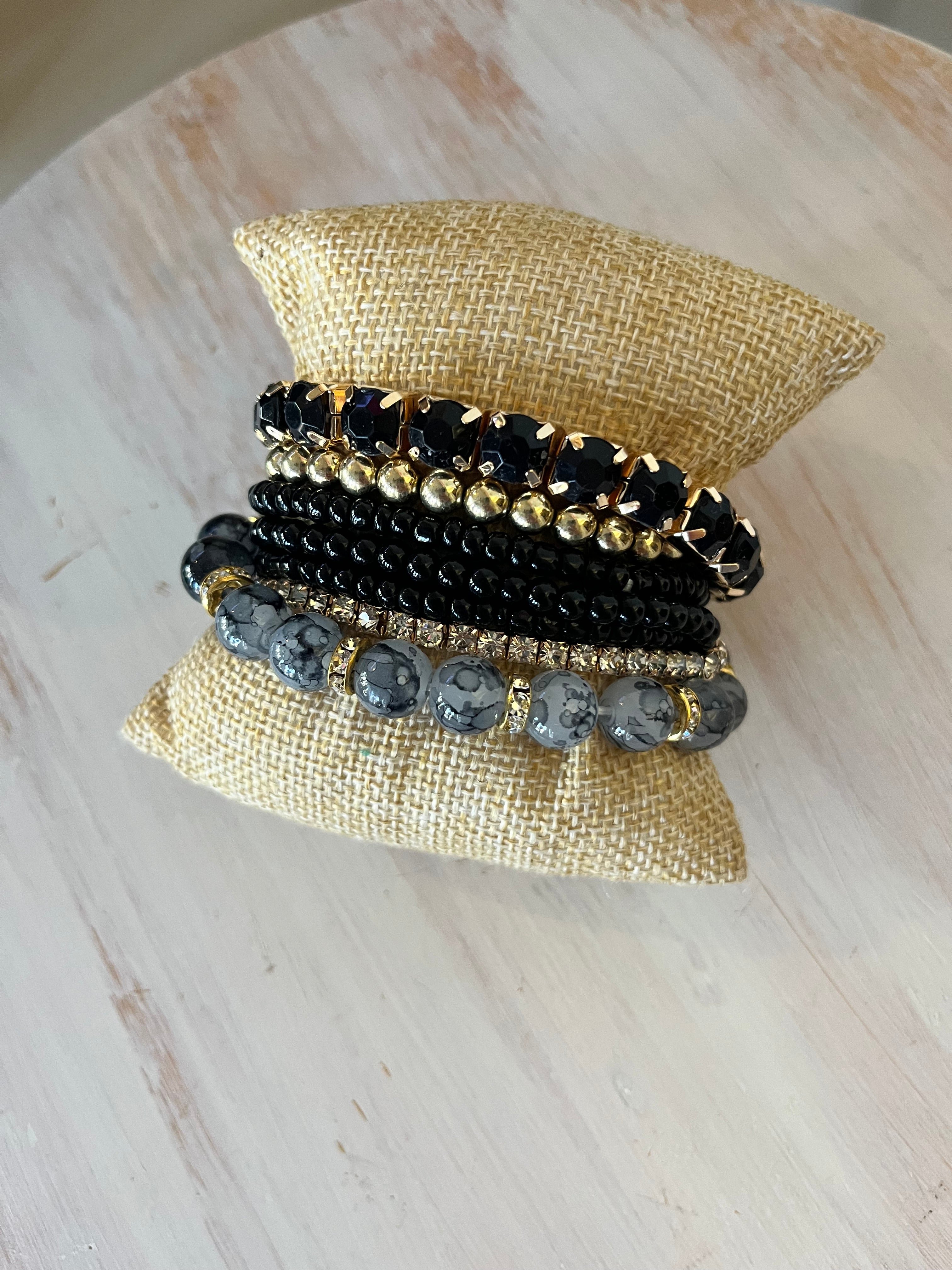 Beautiful seven piece stretch bracelet set. Gorgeous gold-accented beads, rhinestones & bold colored stones.