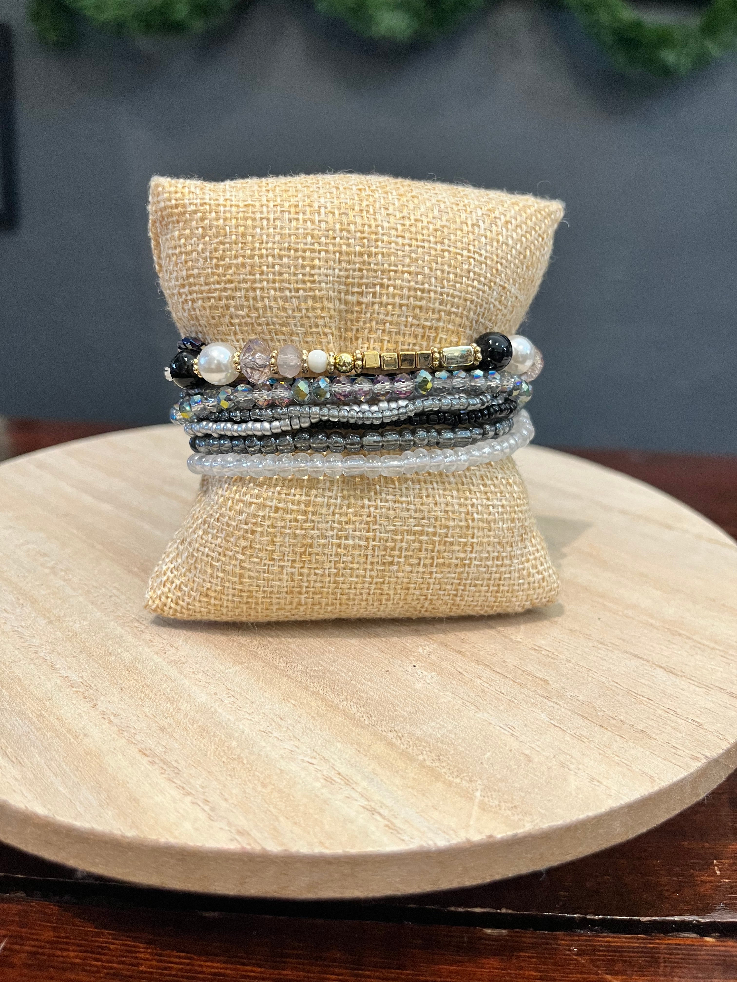 Add this simple bracelet set to complete your look! Each set includes seven bracelets mixed with regular and seed beads, gold accents and charms.