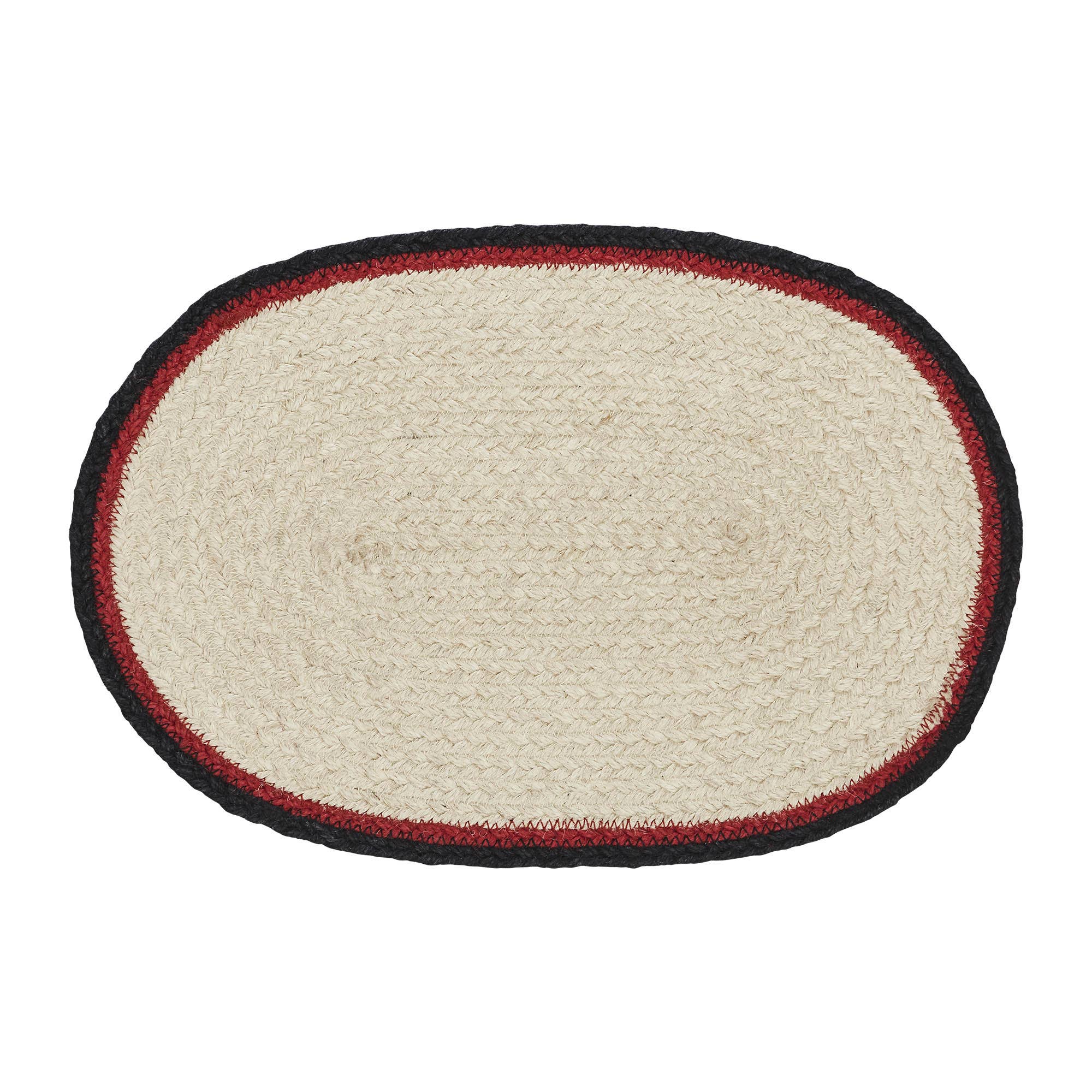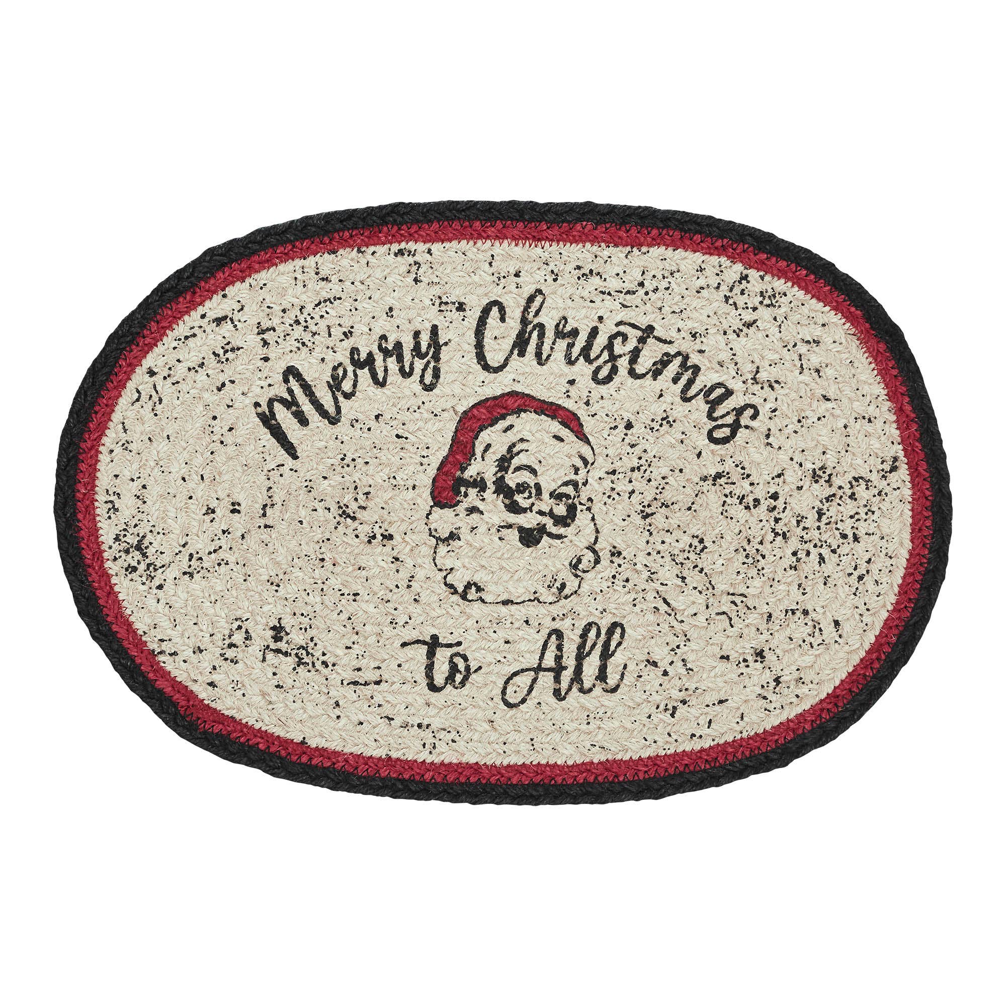 Add a retro pop to your Christmas table decor. The Jolly Ole Santa Placemat includes one oval placemat measuring 10x15 inches. A unique blend of jute and recycled cotton are braided to form a deep creme base with a red and black striped edging. The central creme weave is printed with a vintage inspired Santa print surrounded by the words, Merry Christmas to All. . Coordinates with the Jolly Ole Santa Collection for more festive classic Christmas decor.