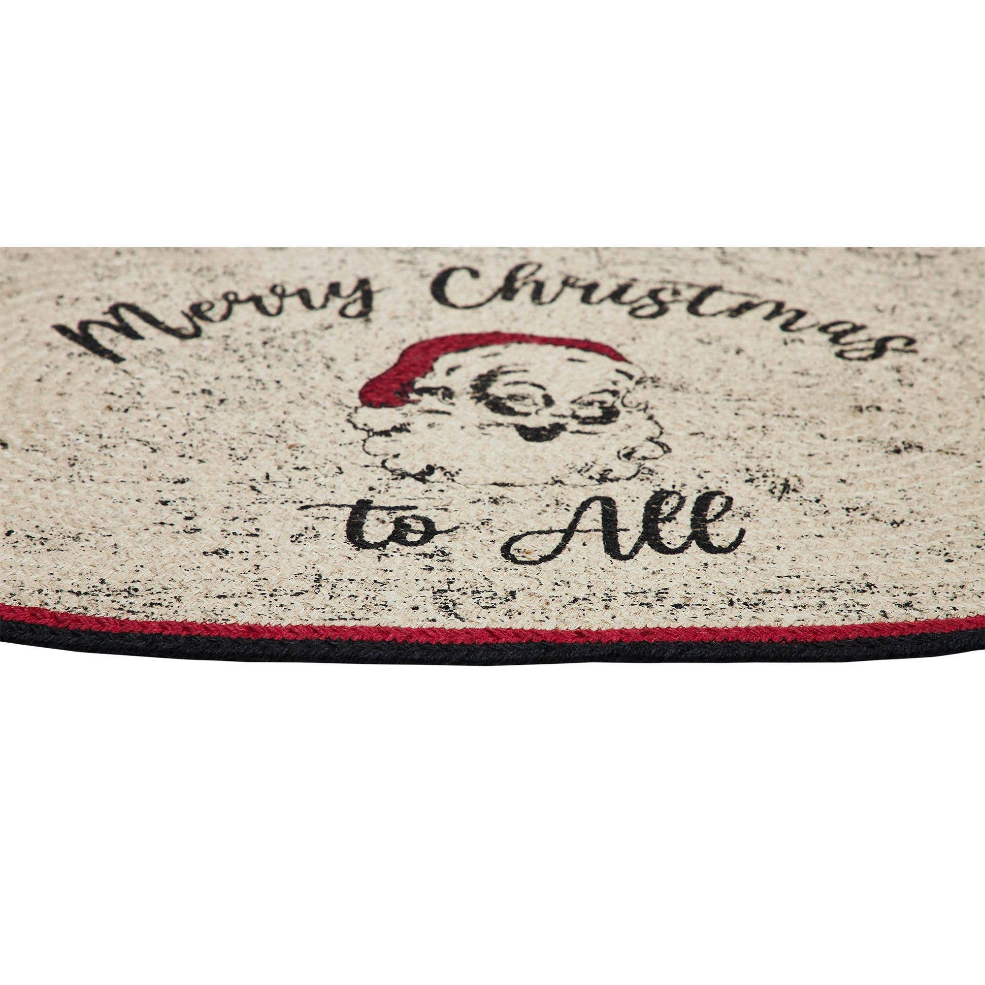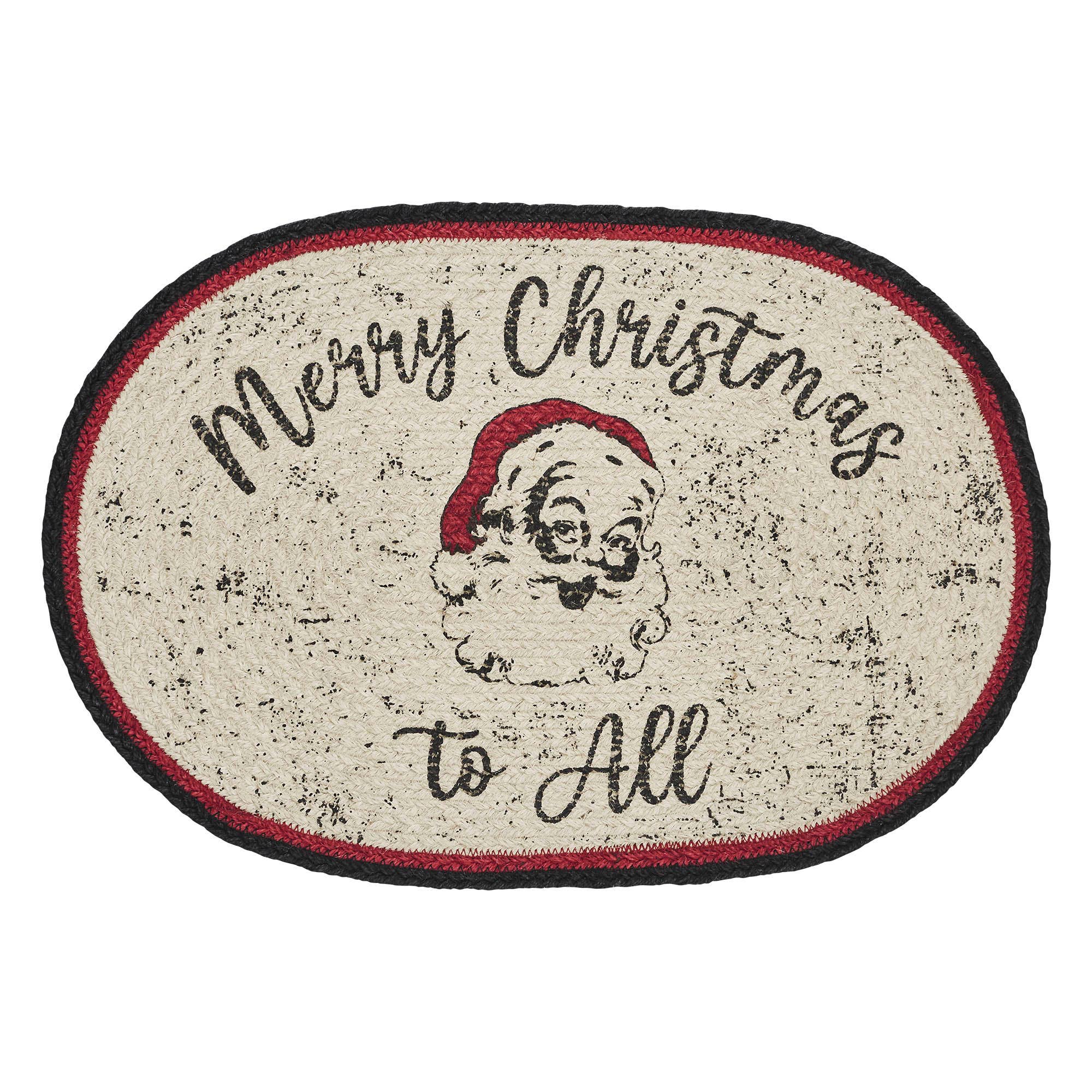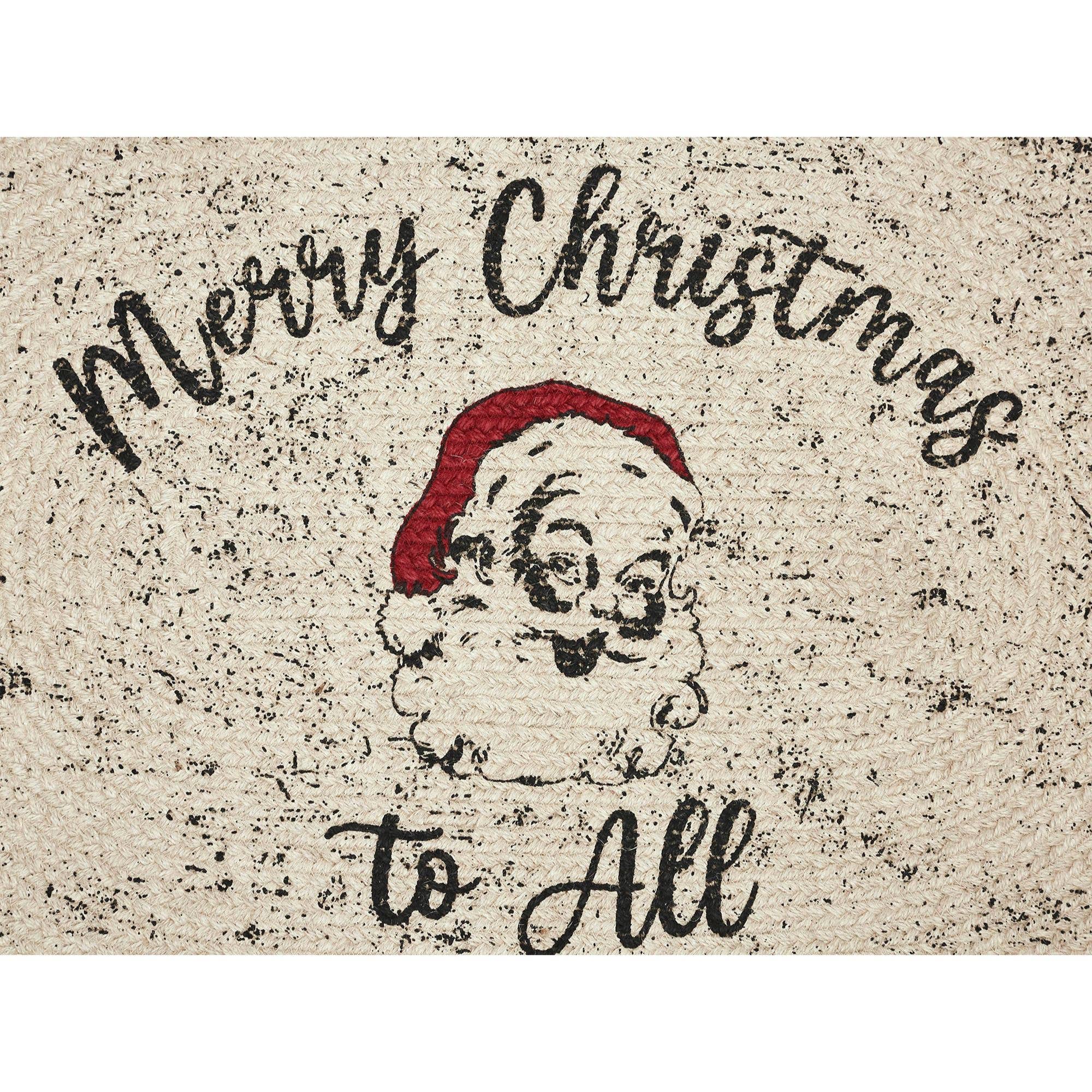 Add a retro pop to your entryways this Christmas with a vintage inspired rug with texture and charm. The Jolly Ole Santa Braided Jute Rug includes one oval rug measuring 20x30 inches. A unique blend of jute and recycled cotton are braided to form a deep creme base with a red and black striped edging. The central creme weave is printed with a vintage inspired Santa that is surrounded by the words, Merry Christmas to All. Coordinates with the Jolly Ole Santa Collection for more festive classic Christmas decor.