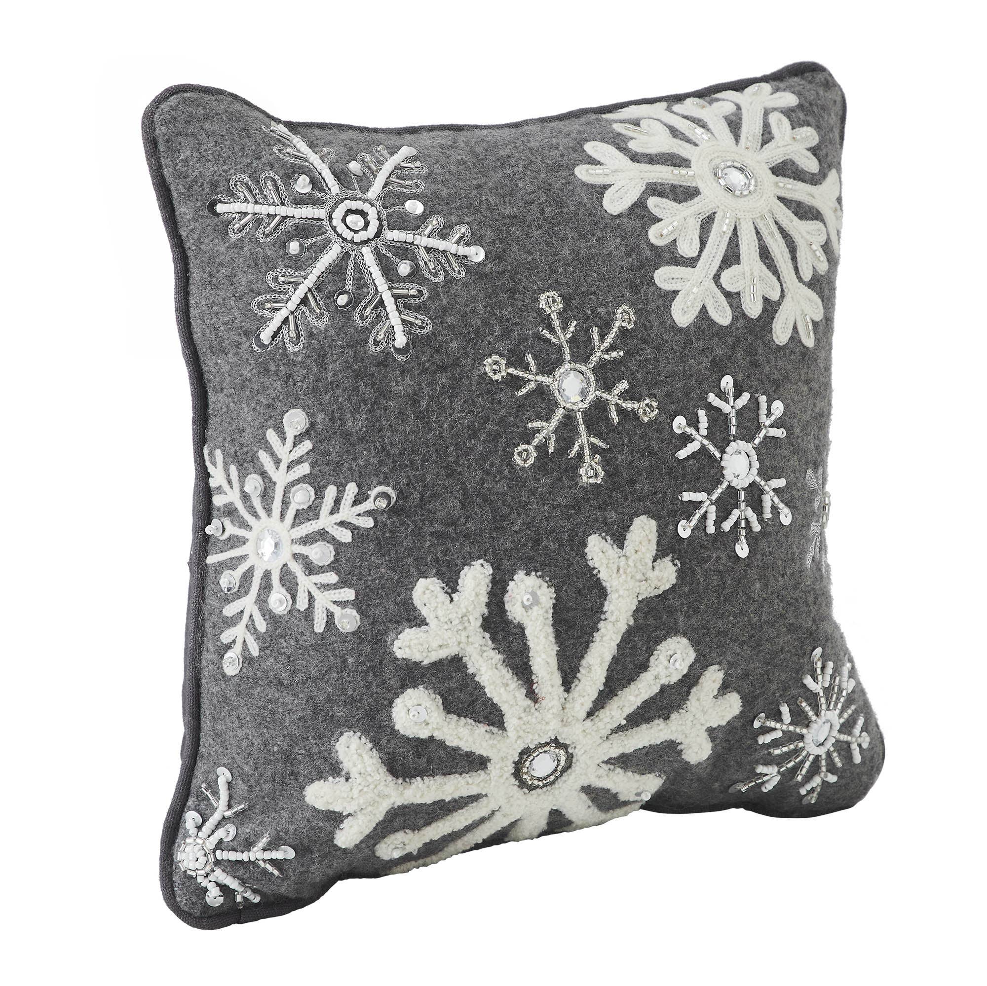 Introducing the Snowflakes Woolen Felt Pillow, a charming addition to your winter and holiday decor. Crafted from wool and cotton, this decorative throw pillow offers both durability and a soft, cozy texture, perfect for adding a touch of festive charm to your home. Measuring 12x12 inches, its square shape provides the ideal size for accenting your bed, entryway bench, or living room sofa with holiday flair. Embrace the beauty of winter with the styled snowflakes adorned with bead trim, delicately embroidered and tufted onto the pillow. The steel grey, medium grey, and bright white hues evoke the serene elegance of the season, creating a cozy and inviting atmosphere in any room. Whether placed in your bedroom, entryway, or living room, this Snowflakes Grey Woolen Felt Pillow adds a touch of farmhouse-inspired charm to your holiday decor. Designed for both style and convenience, this pillow is spot clean only, ensuring easy care and maintenance while preserving its intricate embroidered detail