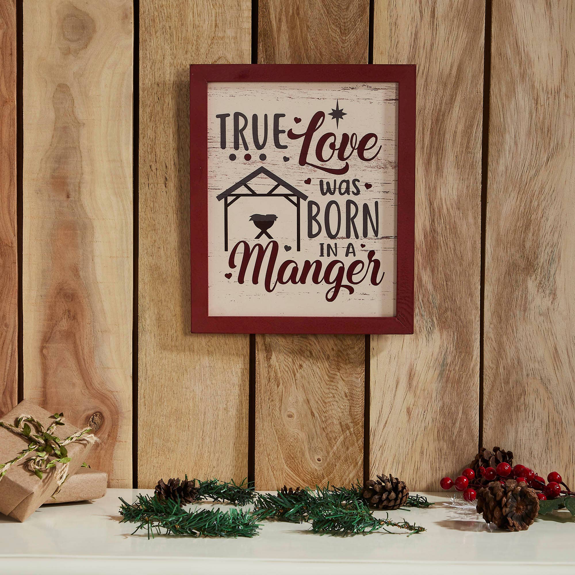Enhance the spirit of Christmas in your home with the VHC Brands True Love Was Born In A Manger Framed Wall Hanging Sign. Measuring 12x10 inches, this rectangular sign serves as a beautiful holiday wall and door decoration, perfect for adding a touch of festive charm to any room. Crafted from MDF, this sign features a timeless message, "True Love was Born in a Manger" printed in elegant text against a backdrop of light creme, Christmas red, and dove grey, evoking a cozy country Christmas theme. Designed for both style and durability, this framed wall hanging sign is easy to maintain and can be wiped clean with a soft cloth, ensuring that it remains looking fresh throughout the holiday season.