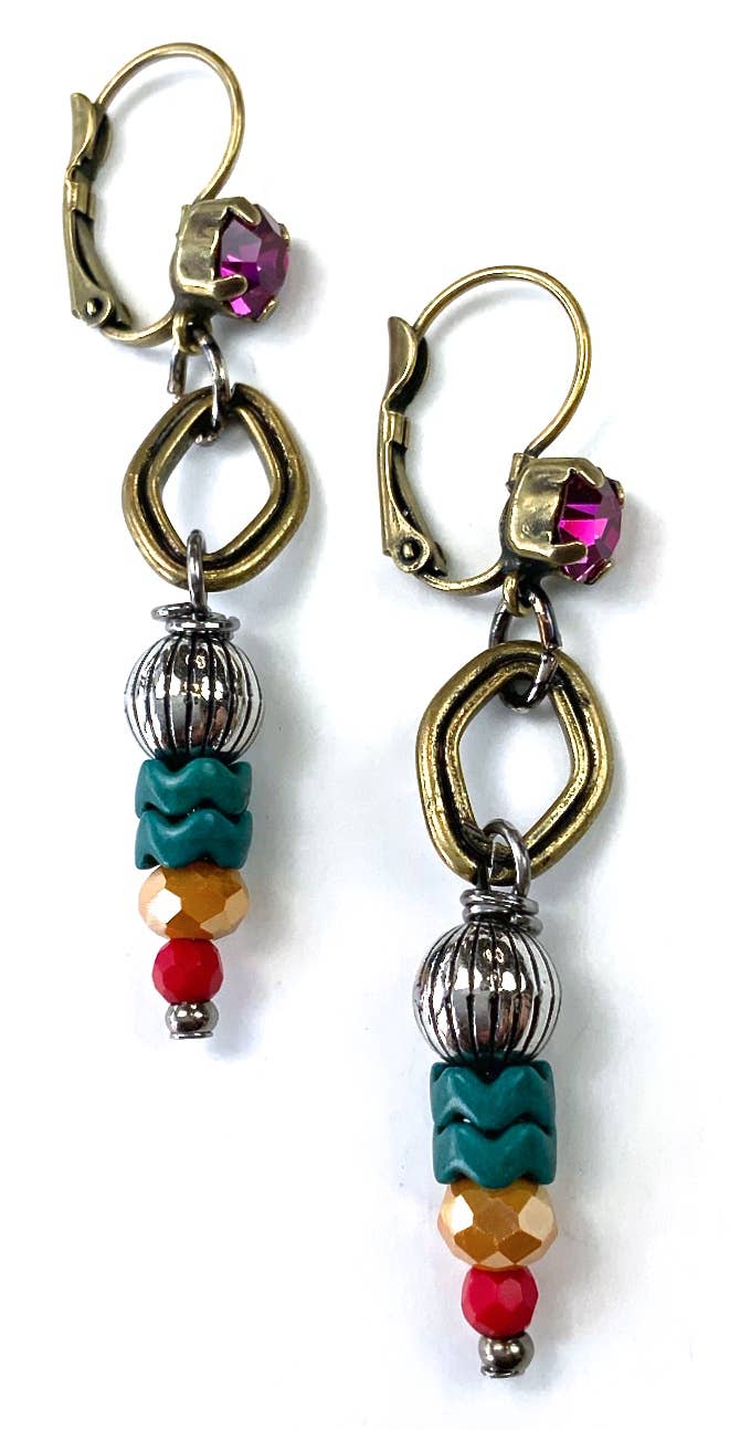 These dangle earrings add a refined touch to any outfit, with a beautiful stone enhancing their allure. The antique gold metal and multi-colored stones make them versatile and a perfect addition to any outfit.