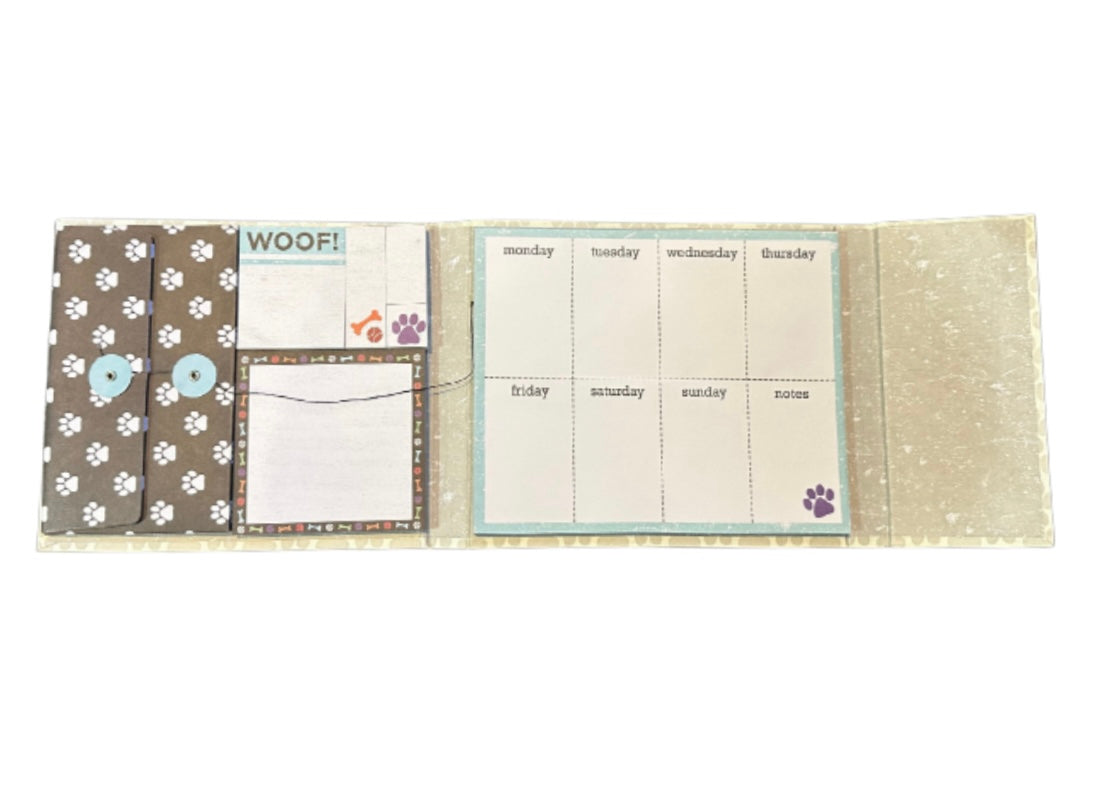 Hardcover weekly organizer with magnetic closure. Inside features an undated calendar, 4 sizes of sticky notes and a closable folder. Perfect for the dog lover!