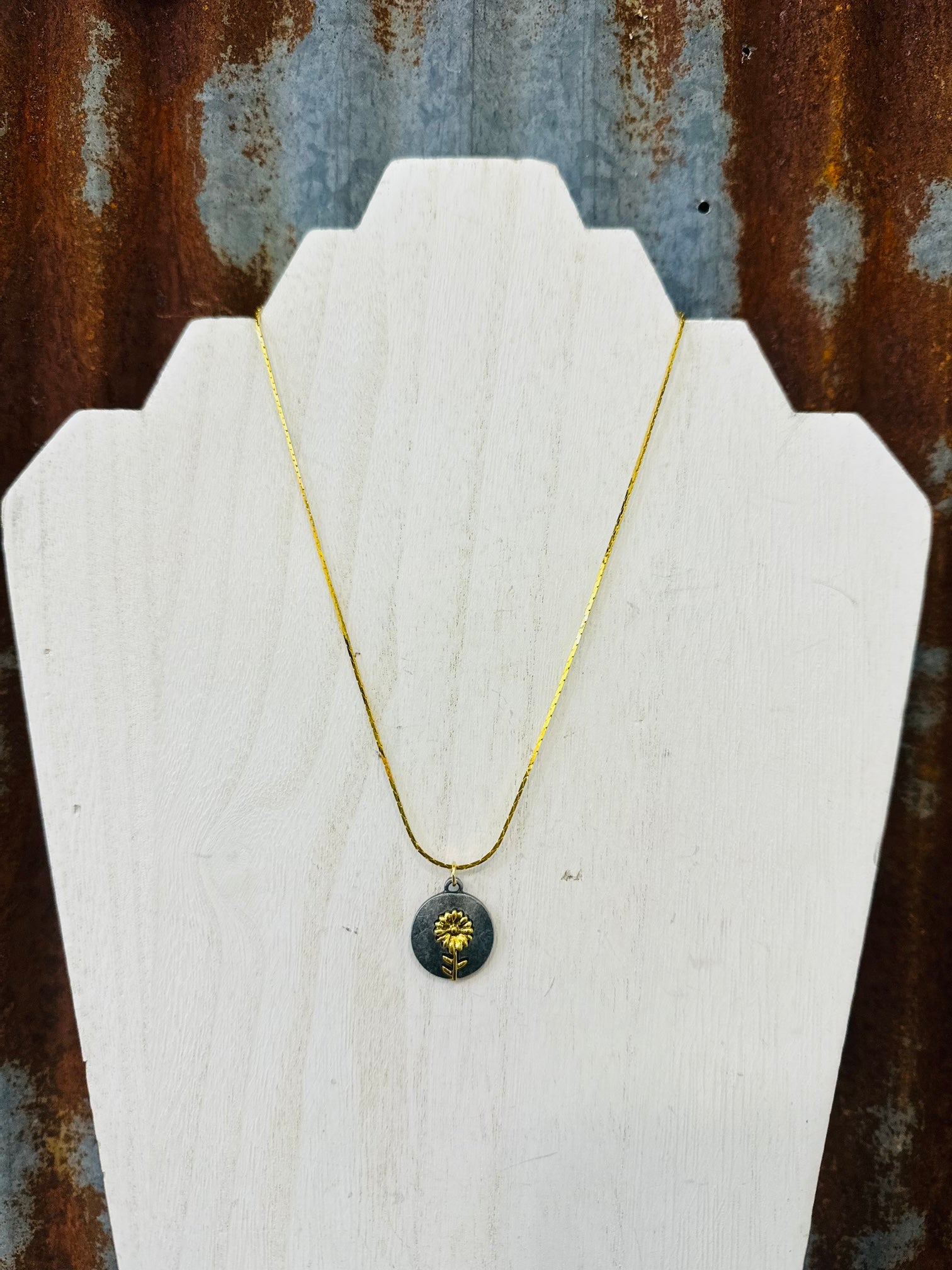 Tiny gold flower on a pewter pendant, on a 15" gold-toned chain