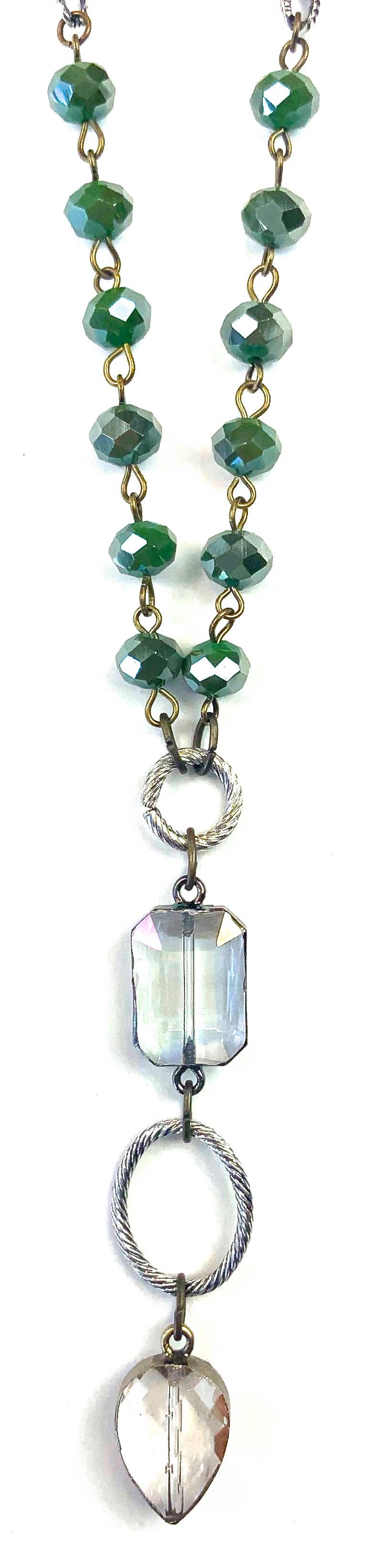 Simple and elegant y-style necklace with lime accent beads and clear tear drop glass charms