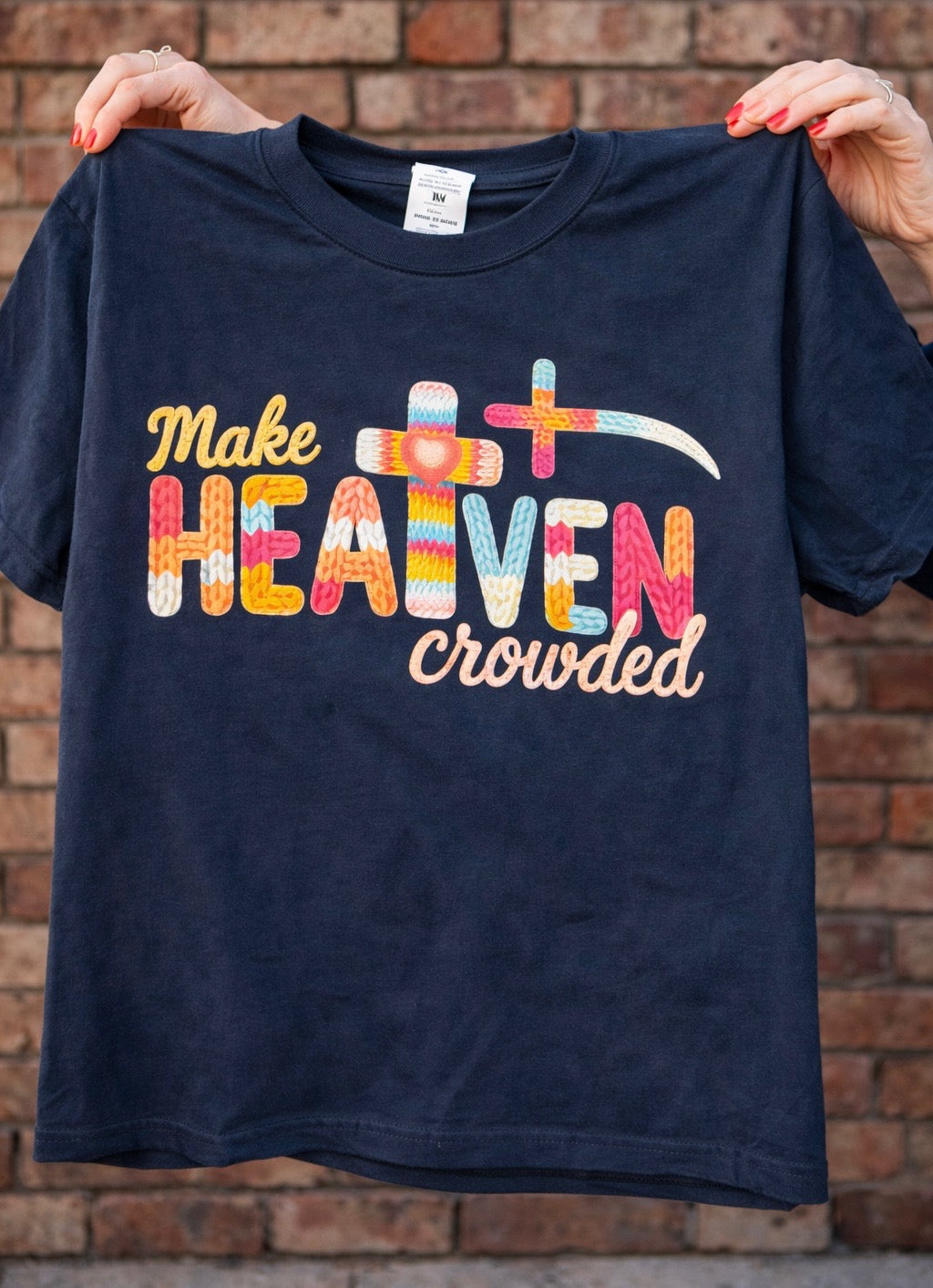 A message that speaks for itself. The Make Heaven Crowded Tee features bold, colorful lettering with playful patchwork-inspired details and a cross accent that makes the design stand out beautifully against the deep navy background.