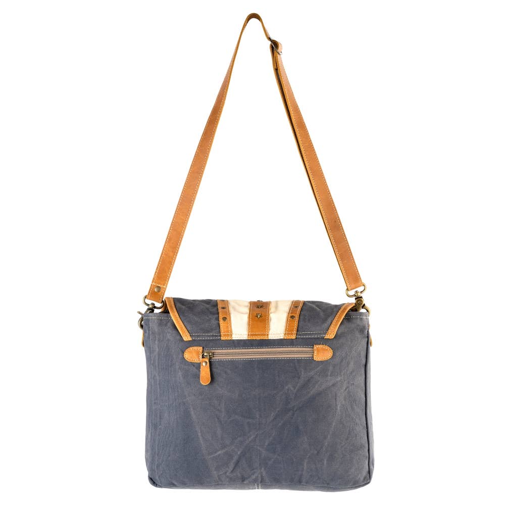 A relaxed, easygoing crossbody made with unique upcycled canvas and genuine leather accents. Finished with bronze star studs on the flap for a fun standout touch. Handmade with durable materials, sturdy hardware, and zippers for everyday use.