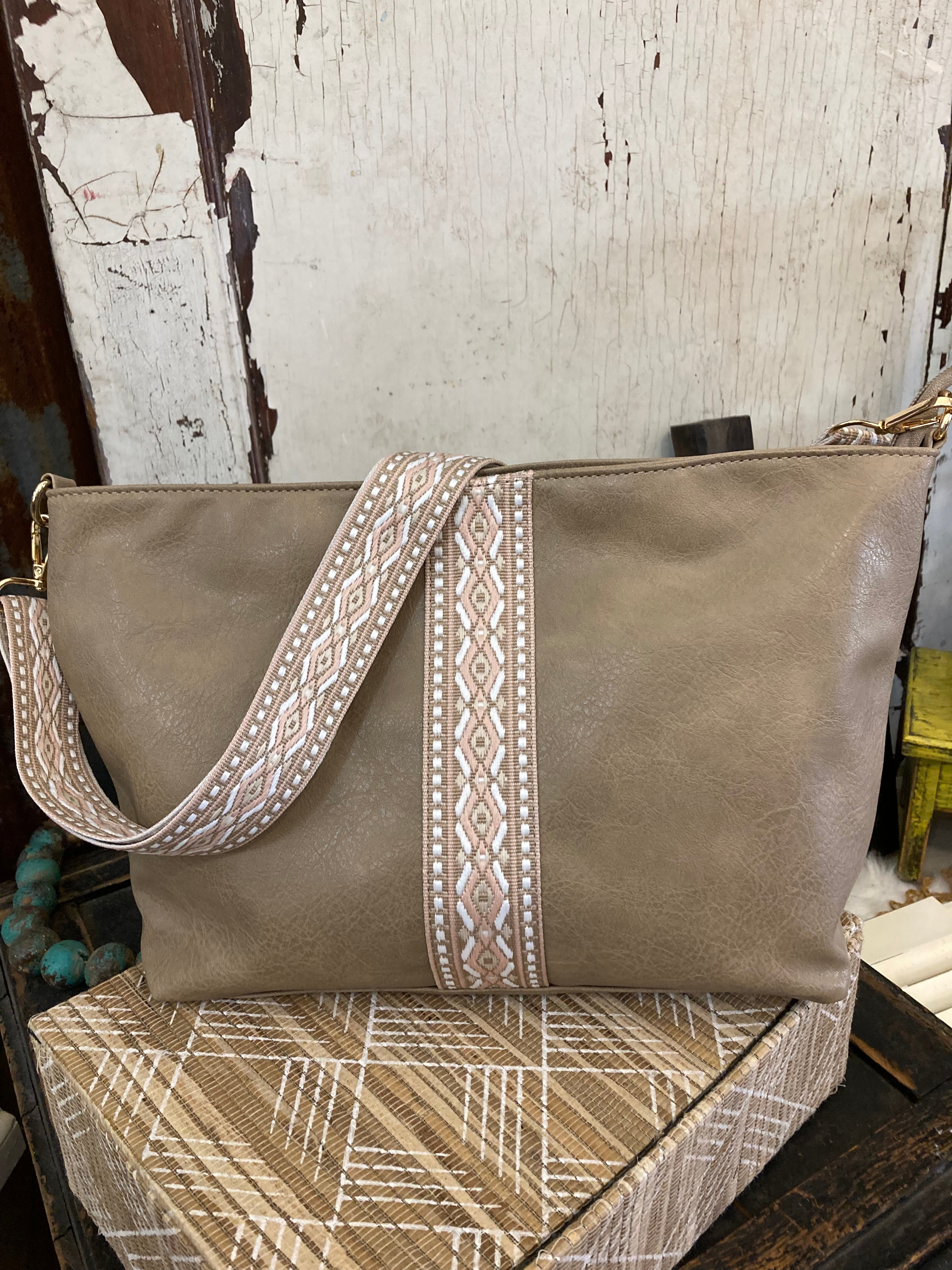 Soft, faux leather body with a textured woven center stripe. * Wide, adjustable strap with intricate woven detailing for a comfortable fit. * Spacious zippered main compartment with interior pockets for organization. * Effortless crossbody design, perfect for everyday wear or casual outings. Approximate size: 9.75 x 4.25 x 16