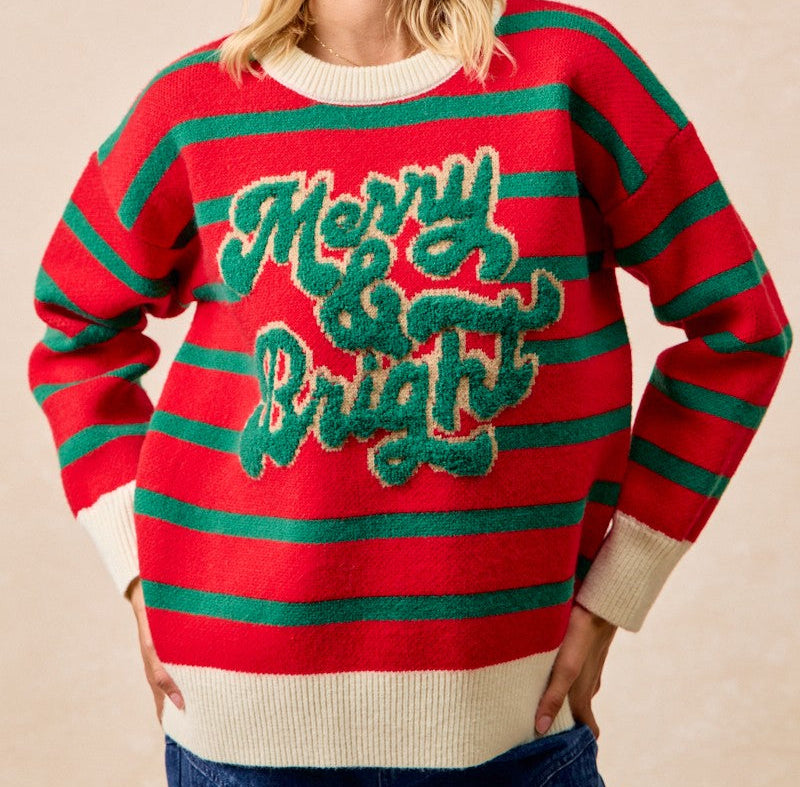 Spread holiday cheer in this festive Merry and Bright Sweater! Featuring bold red and hunter green stripes with a cheerful Merry & Bright applique on the front, this cozy knit brings instant seasonal spirit to your wardrobe. Soft cream accents trim the collar, sleeves, and waistband for a polished finish. Perfect for holiday gatherings, casual celebrations, or anyone ready to embrace the merriest time of year with style and comfort.