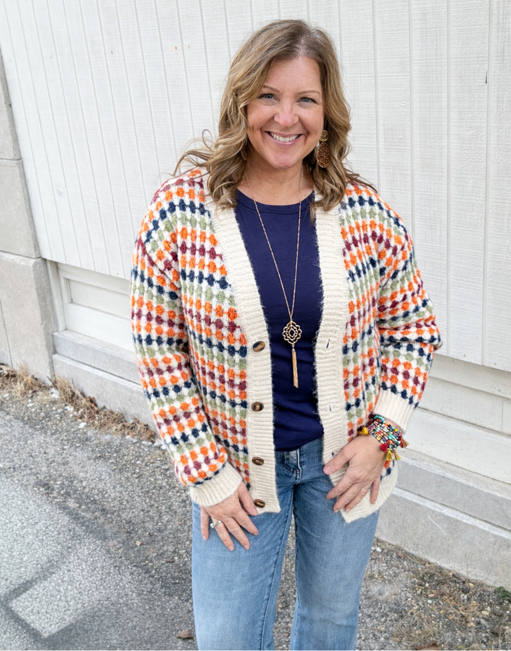 Brighten up your cozy season wardrobe with the Colorful Dotty Knit Sweater Cardigan. Its playful dotty knit adds charming texture and eye-catching detail, while the button-front design lets you style it your way—open for breezy layers or buttoned up for a snug fit. The flattering V-neckline elongates your look, making it perfect for layering over your favorite tees and tops. Embrace fall’s fun and fashion-forward vibes with this cardigan that’s as versatile as it is comfy!