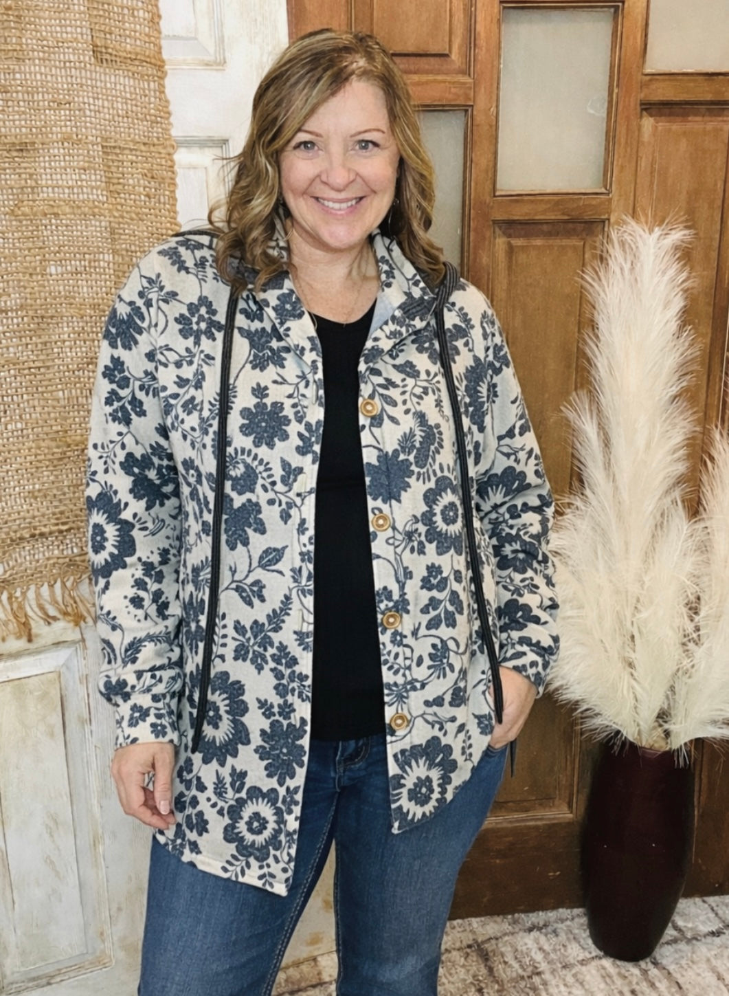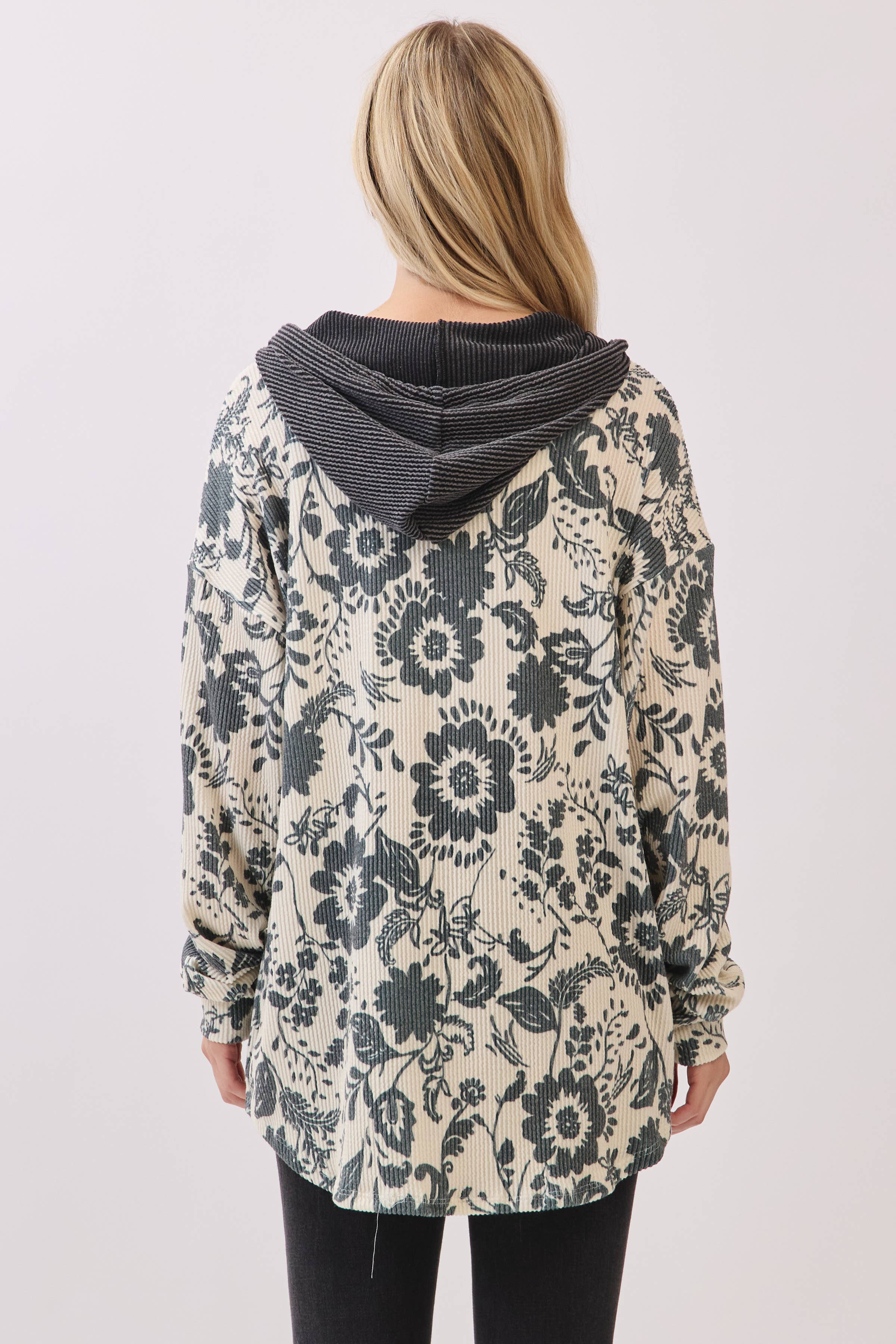 This stylish shacket is crafted from a soft ribbed knit and features an allover floral pattern for a bold, standout look. Designed with a contrast drawstring hood, front button closure, and a relaxed silhouette, it's perfect for layering on breezy days. A cozy yet elevated piece to take you from season to season.