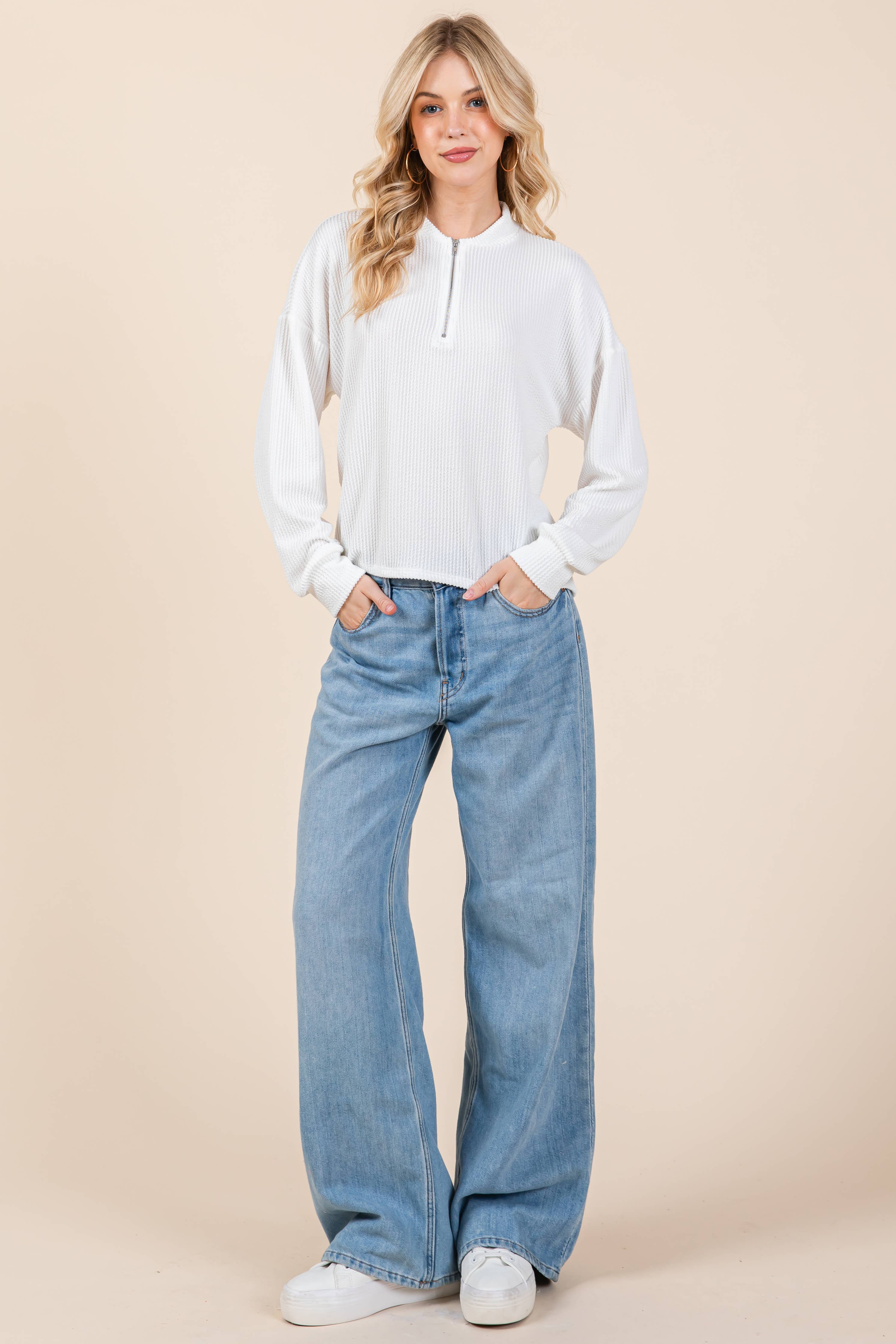 This off-white sweatshirt is made from a soft ribbed, corded-style fabric that feels cozy and easy to wear. The quarter-zip front adds a classic touch, and the drop-shoulder sleeves give it that relaxed, laid-back fit. It’s a simple pullover style with an easy, casual look that pairs well with anything.